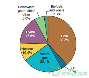 2016年,來(lái)自可燃燃料的發(fā)電量占世界總發(fā)電量的67.3%(其中:65.1%來(lái)自化石燃料;2.3%來(lái)自生物燃料、廢棄物等),水電(包括抽水蓄能)提供了發(fā)電量的16.6%;核電發(fā)電量占比為10.4%;地?zé)?、太?yáng)能、風(fēng)能、潮汐等能源發(fā)電占比為5.6%;而生物燃料和廢棄物等發(fā)電量占比為剩余的2.3%。