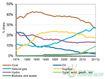 1974年~2017年經(jīng)合組織發(fā)電量,按來(lái)源劃分