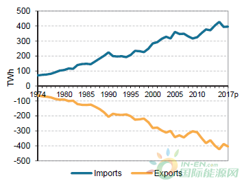 在經(jīng)合組織中,電力進(jìn)口量從1974年的89太瓦時(shí)增長(zhǎng)到2017年的474太瓦時(shí),年均增長(zhǎng)率為4.0%,而同期總電力供應(yīng)的年均增長(zhǎng)率為2.1%。經(jīng)合組織的電力出口量從1974年的81太瓦時(shí)增長(zhǎng)到2017年的495太瓦時(shí),年均增長(zhǎng)率為4.3%。