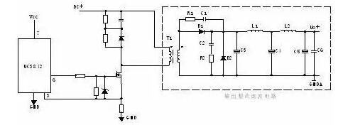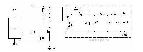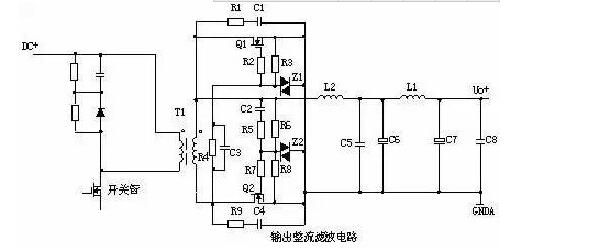 T1為開關(guān)變壓器,其初極和次極的相位同相。D1為整流二極管,D2為續(xù)流二極管,R1、C1、R2、C2為削尖峰電路。L1為續(xù)流電感,C4、L2、C5組成π型濾波器。