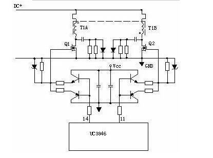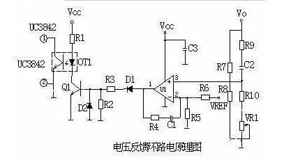 當(dāng)輸出U0升高,經(jīng)取樣電阻R7、R8、R10、VR1分壓后,U1③腳電壓升高,當(dāng)其超過U1②腳基準(zhǔn)電壓后U1①腳輸出高電平,使Q1導(dǎo)通,光耦OT1發(fā)光二極管發(fā)光,光電三極管導(dǎo)通,UC3842①腳電位相應(yīng)變低,從而改變U1⑥腳輸出占空比減小,U0降低。當(dāng)輸出U0降低時,U1③腳電壓降低,當(dāng)其低過U1②腳基準(zhǔn)電壓后U1①腳輸出低電平,Q1不導(dǎo)通,光耦OT1發(fā)光二極管不發(fā)光,光電三極管不導(dǎo)通,UC3842①腳電位升高,從而改變U1⑥腳輸出占空比增大,U0降低。周而復(fù)始,從而使輸出電壓保持穩(wěn)定。調(diào)節(jié)VR1可改變輸出電壓值。反饋環(huán)路是影響開關(guān)電源穩(wěn)定性的重要電路。如反饋電阻電容錯、漏、虛焊等,會產(chǎn)生自激振蕩,故障現(xiàn)