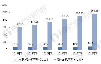 2018-2023年全球風(fēng)電新增和累計(jì)裝機(jī)容量預(yù)測(cè)(單位:GW)