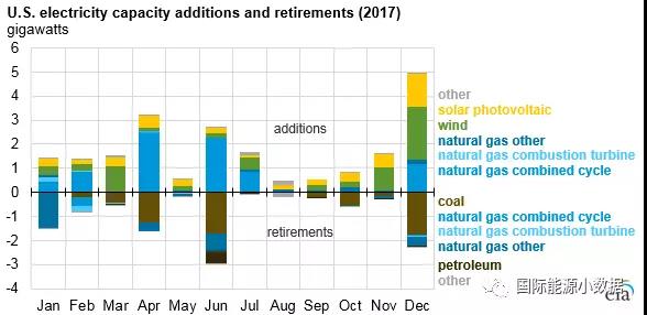 2017年美國(guó)風(fēng)電光伏繼續(xù)大躍進(jìn),燃?xì)獍l(fā)電下跌7.7%,降幅超過(guò)煤電!