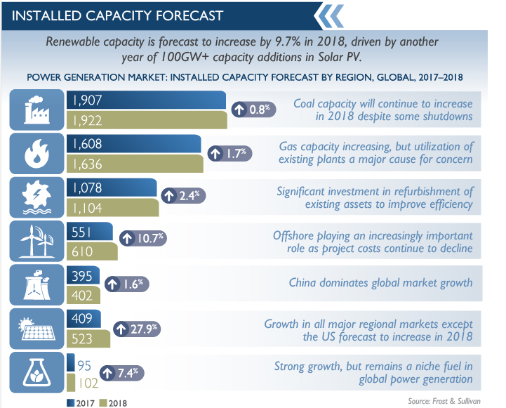 與2017年類似,F(xiàn)rost&Sullivan預(yù)計太陽能占投資的大部分,預(yù)計2018年為1230.3億美元,中國將成為主要投資方。太陽能和風(fēng)能(海上)的需求和投資環(huán)境呈現(xiàn)出積極的態(tài)勢。