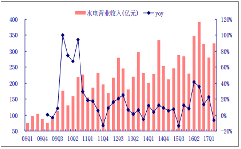 發(fā)電量增長助力收入提升。2017年1-6月,火電行業(yè)營業(yè)收入2989.1億元,同比增長18.1%;水電582.7億元,同比增長3.9%。二季度,火電實現(xiàn)營業(yè)收入1458.3億元,同比提升17.8%;水電324.5億元,同比下滑6.6%。