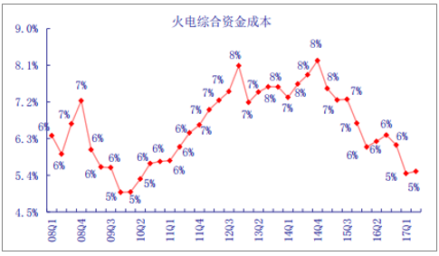 2017年1-6月,火電行業(yè)財務(wù)費(fèi)用199.7億元,同比增加4.6%;財務(wù)費(fèi)用率6.7%,同比減少0.9個百分點(diǎn)。二季度火電財務(wù)費(fèi)用同比上升8.7%;財務(wù)費(fèi)用率7.1%,環(huán)比提高0.8個百分點(diǎn);綜合資金成本保持低位為5.5%。