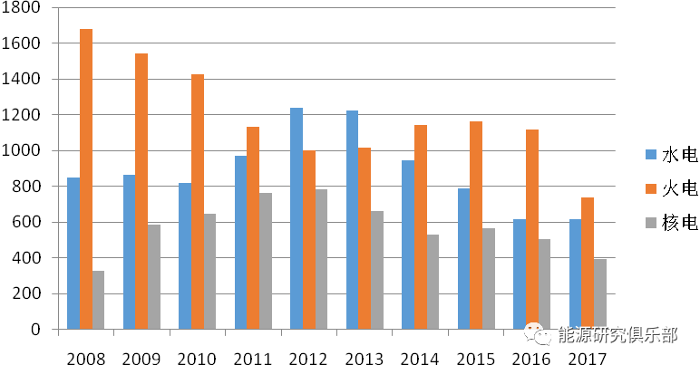 圖22 2008~2017年水電、火電、核電投資情況