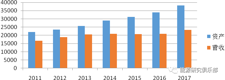 圖25 2011~2017年國(guó)家電網(wǎng)公司資產(chǎn)和營(yíng)收情況