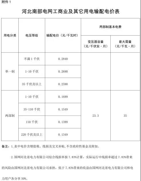 附件:1.河北省南部電網(wǎng)工商業(yè)及其它用電輸配電價(jià)表