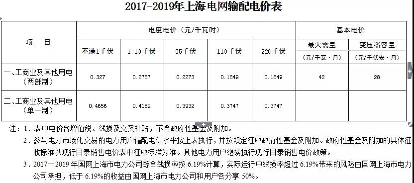 2、2017-2019年上海電網(wǎng)輸配電價(jià)表