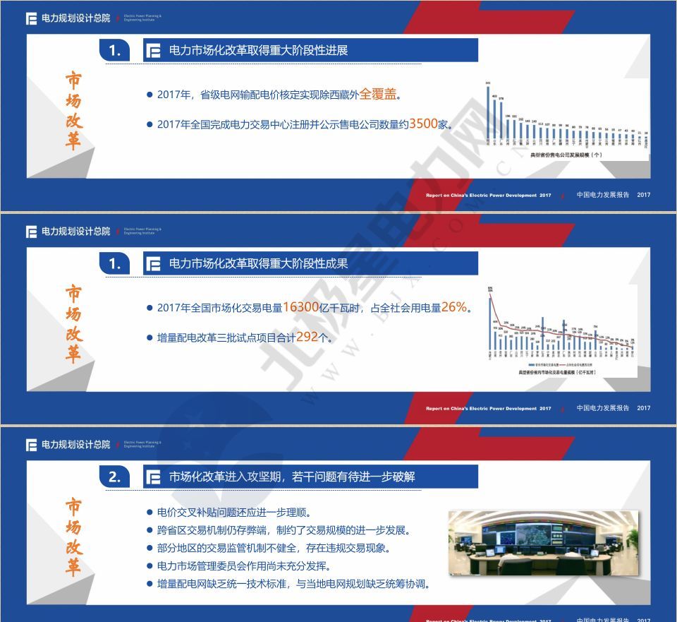 《報告》分十個篇章,從發(fā)展環(huán)境、需求分析、電源發(fā)展、電網(wǎng)發(fā)展、供需形勢、電力技術(shù)、電力經(jīng)濟、電力改革、政策解讀、熱點研究等多個方面對2017年我國電力發(fā)展狀況進行全面梳理、綜合歸納,分析預測了未來三年電力需求水平,并在此基礎上提出了各類電源、各級電網(wǎng)發(fā)展展望;深入解讀了過去一年重點行業(yè)政策及電價政策;在全面總結(jié)電力體制改革進展的基礎上,分析展望了近期改革重點;在總結(jié)上年度電源電網(wǎng)造價水平基礎上,對未來三年電力工程造價變化趨勢進行了分析判斷;以專題文章形式深入剖析了新能源消納、電力現(xiàn)貨市場建設等當前電力行業(yè)熱點焦點問題。