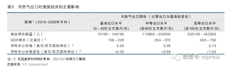 外界對美國LNG出口始終存在正反兩種聲音。目前業(yè)界和政界普遍認為,適量的出口LNG對拉動美國經(jīng)濟增長、創(chuàng)造就業(yè)利大于弊,此外可以降低燃料成本,提振美國制造業(yè),對提高政府稅收、減少進口依賴、平衡貿(mào)易赤字也將起到積極作用,還有助于加強與周邊國家的貿(mào)易聯(lián)系(見表3)。