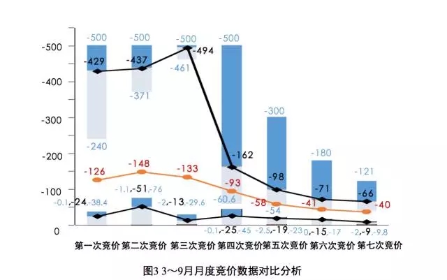 廣東電力市場2016年3~9月月度競價(jià)數(shù)據(jù)對比分析如圖3所示。深藍(lán)色部分為發(fā)電廠或大用戶(售電公司)所申報(bào)的絕對值較大的價(jià)差(負(fù)值),淺藍(lán)色部分為發(fā)電廠或大用戶(售電公司)所申報(bào)的絕對值較小的價(jià)差(負(fù)值),黑色點(diǎn)與實(shí)線表示平均申報(bào)價(jià)差。橙色點(diǎn)與實(shí)線表示平均結(jié)算價(jià)差,代表發(fā)電廠向需求方平均讓利的程度。根據(jù)數(shù)據(jù)分析我們可以得到如下結(jié)論: