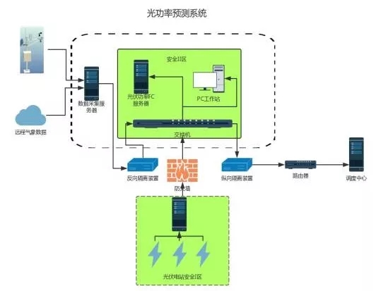 系統(tǒng)需要考慮實時氣象數(shù)據(jù)、電站功率數(shù)據(jù)、運營數(shù)據(jù)的搜集,所以系統(tǒng)是由數(shù)據(jù)采集、數(shù)據(jù)處理、遠(yuǎn)程氣象數(shù)據(jù)模型、光伏功率預(yù)測軟件、圖形處理等模塊組成,同時考慮到安全性和安全傳輸?shù)囊?guī)定,需要加上相應(yīng)功能匹配的服務(wù)器、反向隔離安全裝置、防火墻、縱向隔離裝置、交換機等硬件設(shè)備,整個系統(tǒng)架構(gòu)需符合電力生產(chǎn)數(shù)據(jù)傳輸安全規(guī)定。