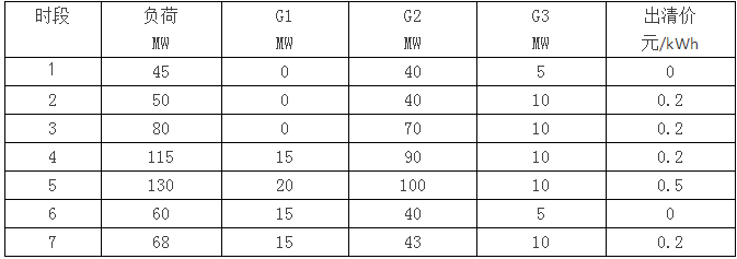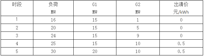 第一個(gè)例子考慮傳統(tǒng)電力系統(tǒng),沒(méi)有風(fēng)電、光伏等可再生能源的情況。假設(shè)系統(tǒng)中有兩個(gè)發(fā)電主體,發(fā)電商G1擁有一個(gè)額定容量為30MW的火電機(jī)組,最小出力為15MW;發(fā)電商G2擁有一個(gè)額定容量為100MW的火電機(jī)組,最小出力40MW。G1、G2的微增發(fā)電成本分別為0.5元/kWh及0.2元/MWh。假設(shè)市場(chǎng)競(jìng)爭(zhēng)充分,G1、G2的微增發(fā)電報(bào)價(jià)等于其真實(shí)的成本。表1給出了幾個(gè)時(shí)段下系統(tǒng)出清的結(jié)果。