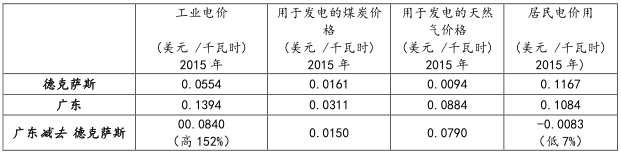 表 1 廣東與德克薩斯的電價以及發(fā)電燃料價格對比