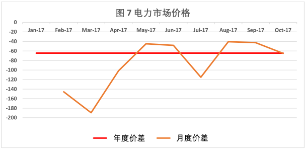 廣東目前的電力批發(fā)市場分為兩部分。第一部分是每年一次的年度雙邊協(xié)商,涵蓋了交易電量的 80%;第二部分是月度集中競價,涵蓋了交易電量的 20%。2017 年的市場交易總量是 110 TWh,其中大約 20 TWh 是在月度交易市場上的交易。這意味著只有 4%(即 20%的 20%)的電力總需求是通過月度交易市場得到滿足的。(廣東省電力消費總需求中只有 20%參與市場交易。)月度交易市場對售電公司的市場份額有一個 20%的限制,但年度交易市場對售電公司的市場份額沒有限制。廣東電力市場上目前的所謂市場價,實際上只是與管制零售價格相比的價差。最大價差是-500 個基點(1 個基點=0.001 元/千瓦時)。當(dāng)前的市場覆蓋了 4000 個大型用戶。典型的大型用戶是像大通訊公司或金屬工廠那樣的企業(yè)。年度市場的價差大約是 64.5 個基點(0.0645 元/千瓦時),而月度市場的價差在此基礎(chǔ)上上下波動(見圖 7),而且這種波動已經(jīng)體現(xiàn)在一天的不同時間里(峰、平均、谷),幅度為+/-0.3元/千瓦時。2018 年,電力市場將覆蓋 180 TWh 和所有的天然氣、核電、風(fēng)電和水電。