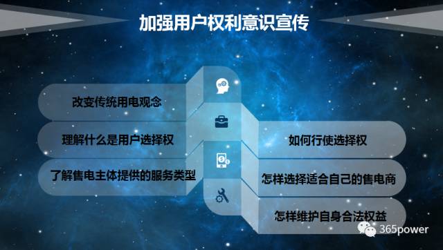 通過政府及電力主管部門在媒體、網(wǎng)絡(luò)等渠道地宣傳教育,使用戶理解并懂得行使其選擇權(quán),了解售電側(cè)改革對電力市場的有利影響,了解售電主體能夠提供的服務(wù)和自己受到保護(hù)的合法權(quán)力,了解如何對比分析并選擇最適合自己的售電商等。真正加強(qiáng)用戶權(quán)利意識的宣傳,才能是用戶更好的參與改革,形成積極活躍的市場化競爭氛圍,確保售電側(cè)改革的持續(xù)發(fā)展。