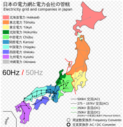 日本東部和西部一直斗的很厲害,所以出現(xiàn)在東京也就是日本島的東部中心購(gòu)置的是德國(guó)AEG的50赫茲發(fā)電機(jī),而在大阪這個(gè)日本的西部中心購(gòu)置的是美國(guó)通用電氣的60赫茲的發(fā)電機(jī),這個(gè)是大約在1895年-1896年之間的事情。由于小日本東部和西部長(zhǎng)期競(jìng)爭(zhēng)、相互不服,所以這個(gè)電網(wǎng)頻率的“一國(guó)兩制”一直保留到現(xiàn)在,也算是一朵奇葩。