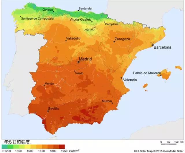 西班牙坐落于伊比利亞半島南部,每個從西班牙旅行回來的人都會帶當(dāng)?shù)刈钬撌⒚?ldquo;伊比利亞火腿”。伊比利亞北連歐洲,南接非洲,地處要塞,渾然天成;它位于北緯40度上下,被大西洋和地中海環(huán)繞,具備得天獨厚的風(fēng)光資源,也因此,西班牙才有大力發(fā)展可再生能源的初始條件。