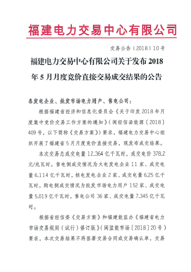 福建2018年5月月度競(jìng)價(jià)直接交易成交結(jié)果