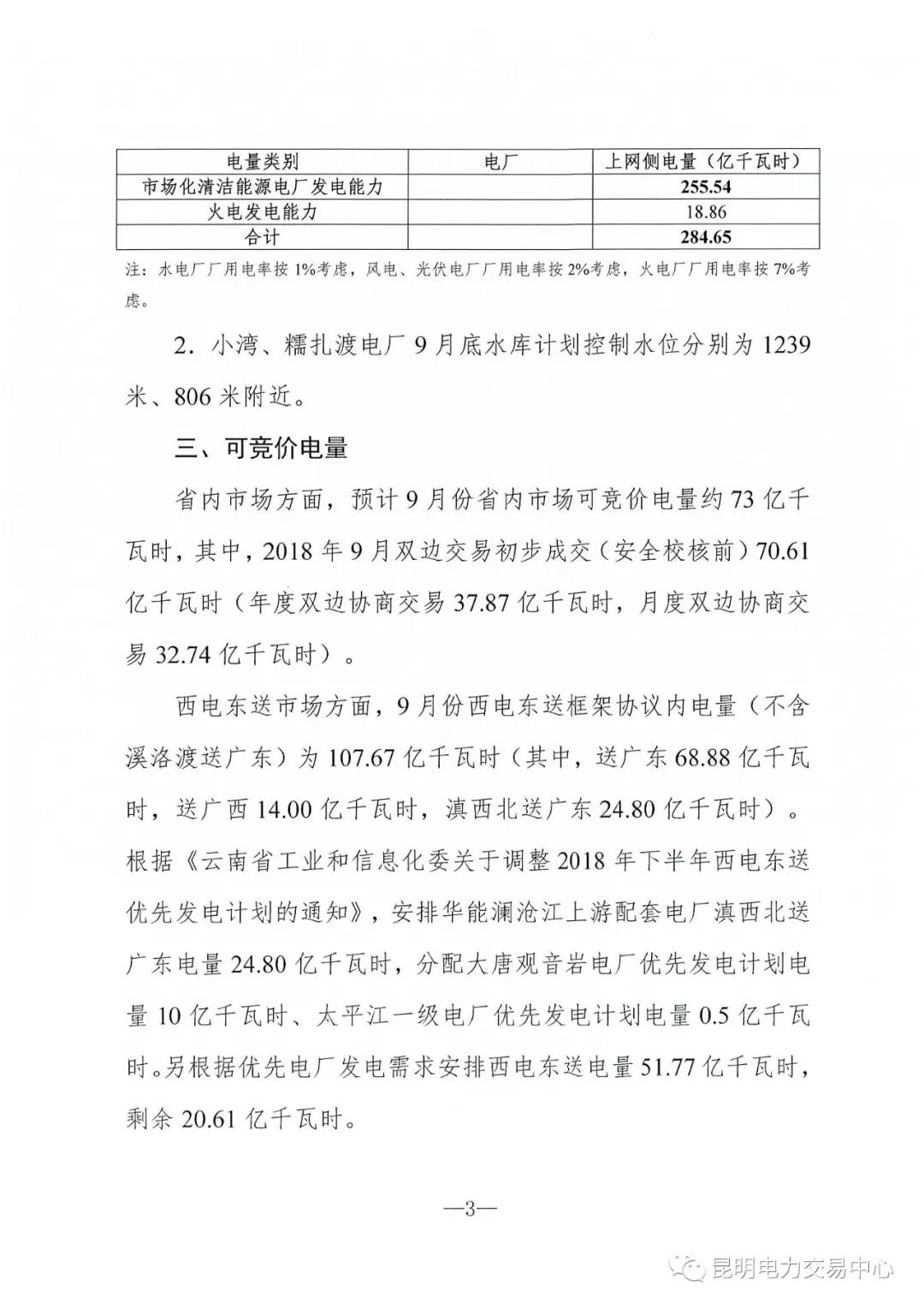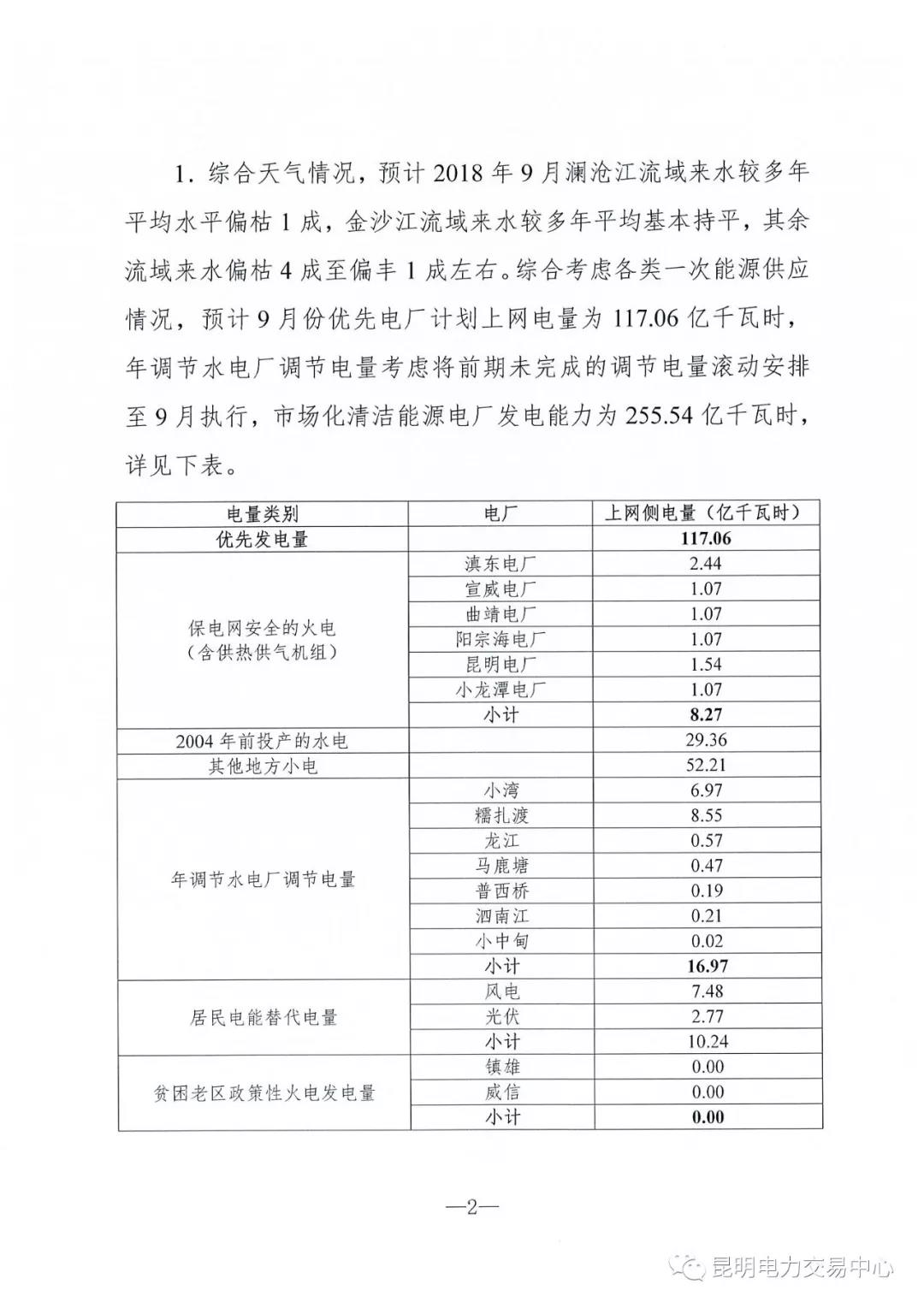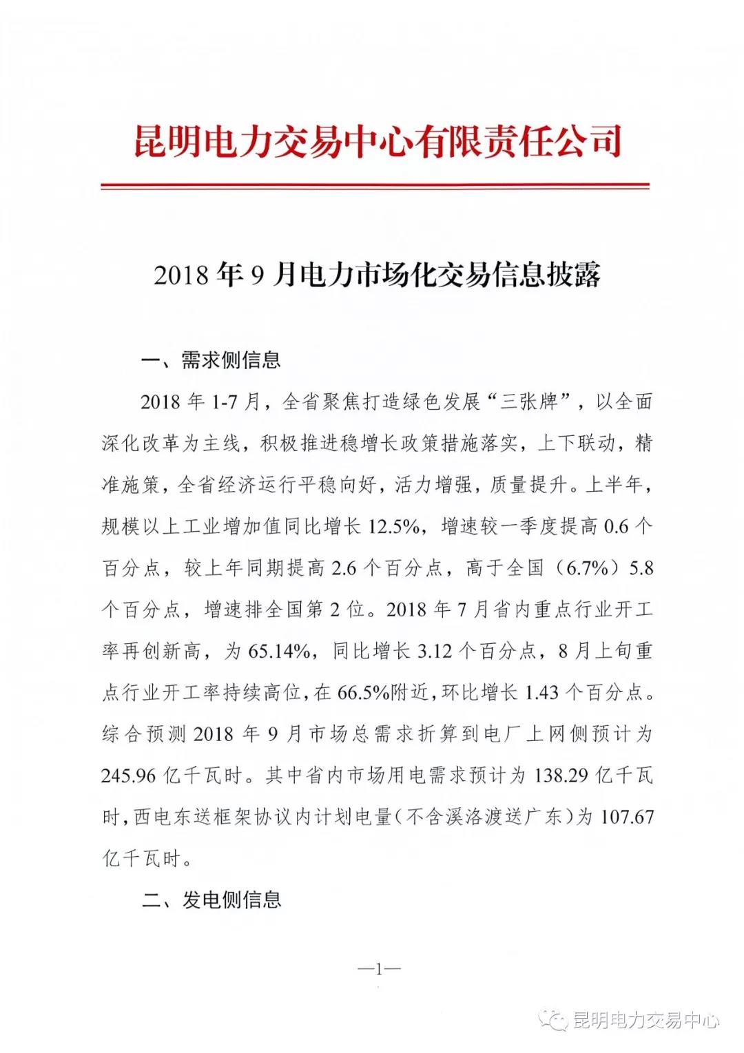 昆明電力交易中心日前發(fā)布了《2018年9月電力市場化交易信息披露》,需求側:綜合預測9月份市場用電需求245.96億千萬時。發(fā)電側:優(yōu)先發(fā)電計劃上網117.06億千瓦時,清潔能源發(fā)電255.54億千瓦時。8月省內市場可競價交易電量約73億千瓦時。