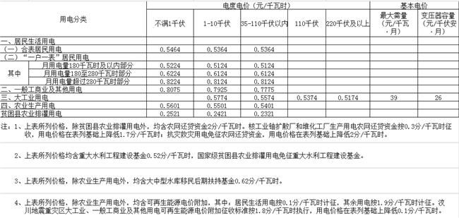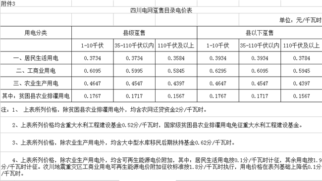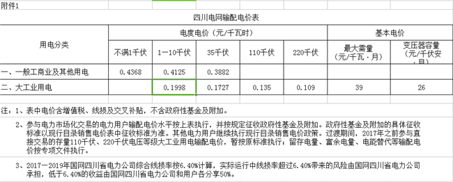 一、四川電網(wǎng)(含2016年及以后新改制供電公司)一般工商業(yè)及其他用電目錄銷售電價(jià)每千瓦時(shí)下調(diào)0.85分錢,一般工商業(yè)及其他用電輸配電價(jià)和躉售工商業(yè)電價(jià)同步下調(diào)。四川電網(wǎng)供區(qū)內(nèi)現(xiàn)行一般工商業(yè)及其他用電價(jià)格低于本通知公布的四川電網(wǎng)目錄銷售電價(jià)的,銷售電價(jià)水平暫維持不變。