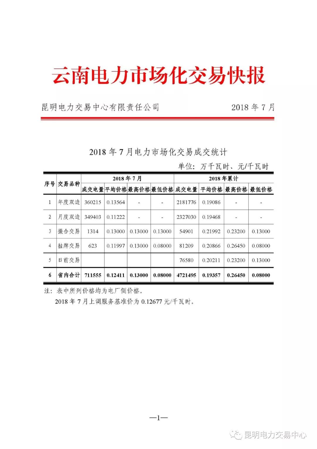 昆明電力交易中心日前發(fā)布了《云南電力市場(chǎng)化交易快報(bào)(2018年7月)》,7月月度雙邊交易成交電量34 9億千瓦時(shí)。詳情如下: