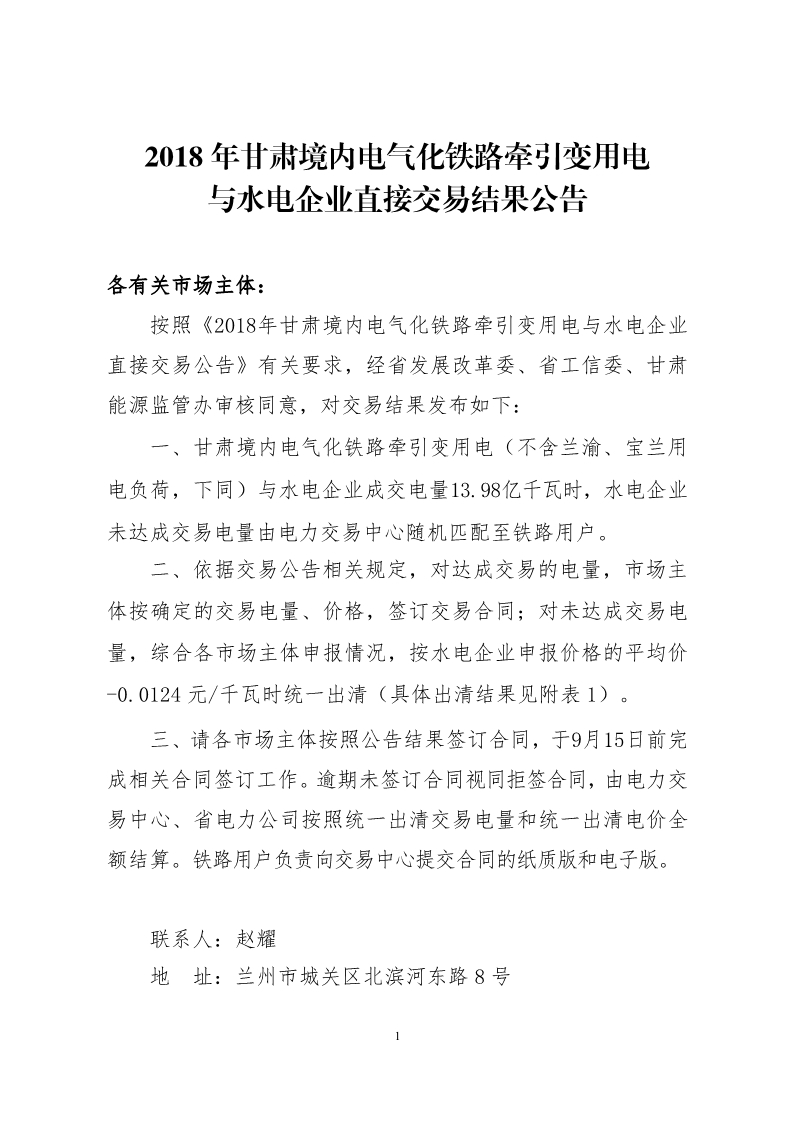 甘肅電力交易中心今日發(fā)布了《2018年甘肅境內(nèi)電氣化鐵路牽引變用電與水電企業(yè)直接交易公告》,與水電企業(yè)成交電量13.98億千瓦時,水電企業(yè)未達成交易電量由電力交易中心隨機匹配至鐵路用戶。對未達成交易電量,安水電企業(yè)申報價格的平均價-0.0124元/千瓦時統(tǒng)一出清。詳情如下: