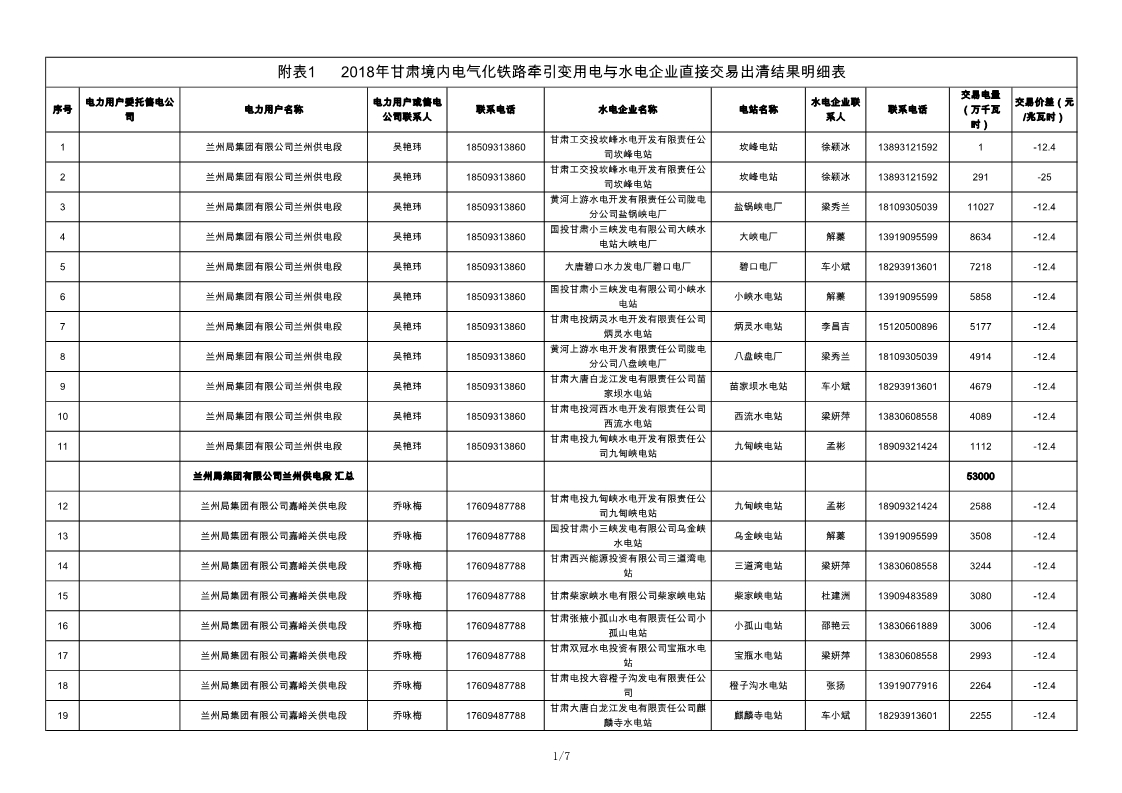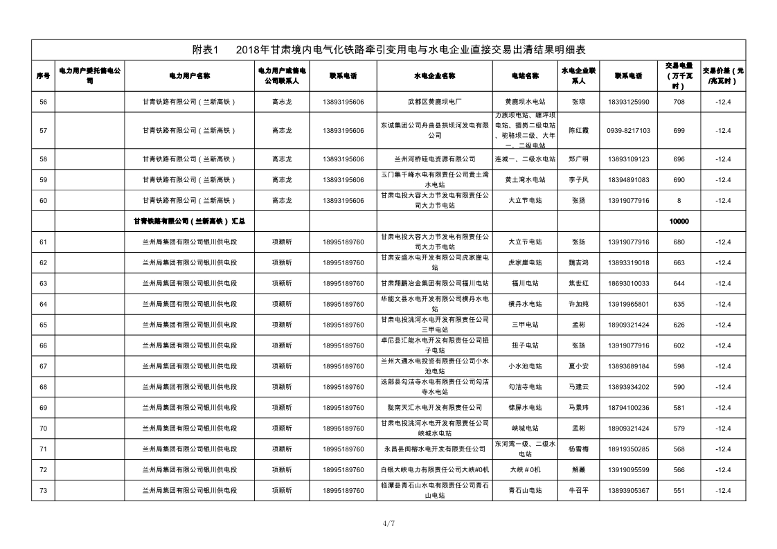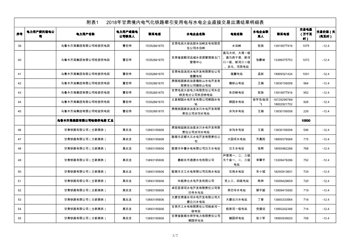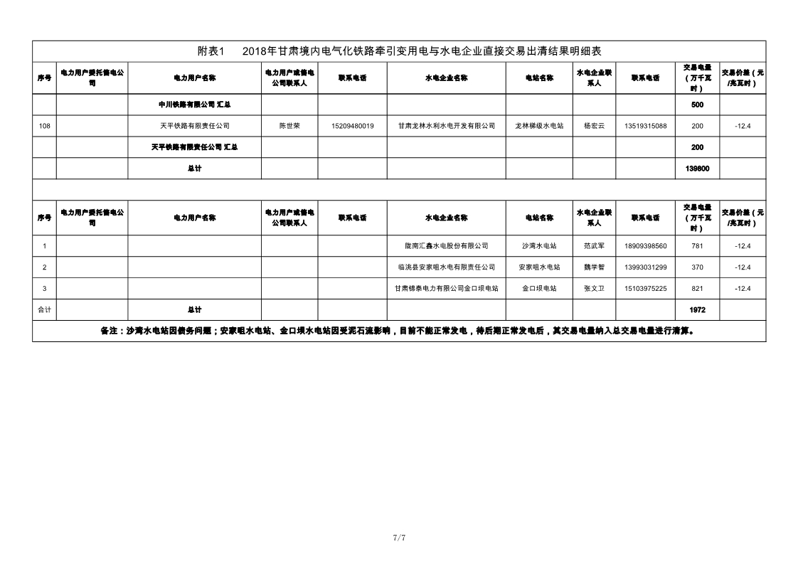 2018年甘肅境內(nèi)電氣化鐵路牽引變用電與水電企業(yè)直接交易結(jié)果
