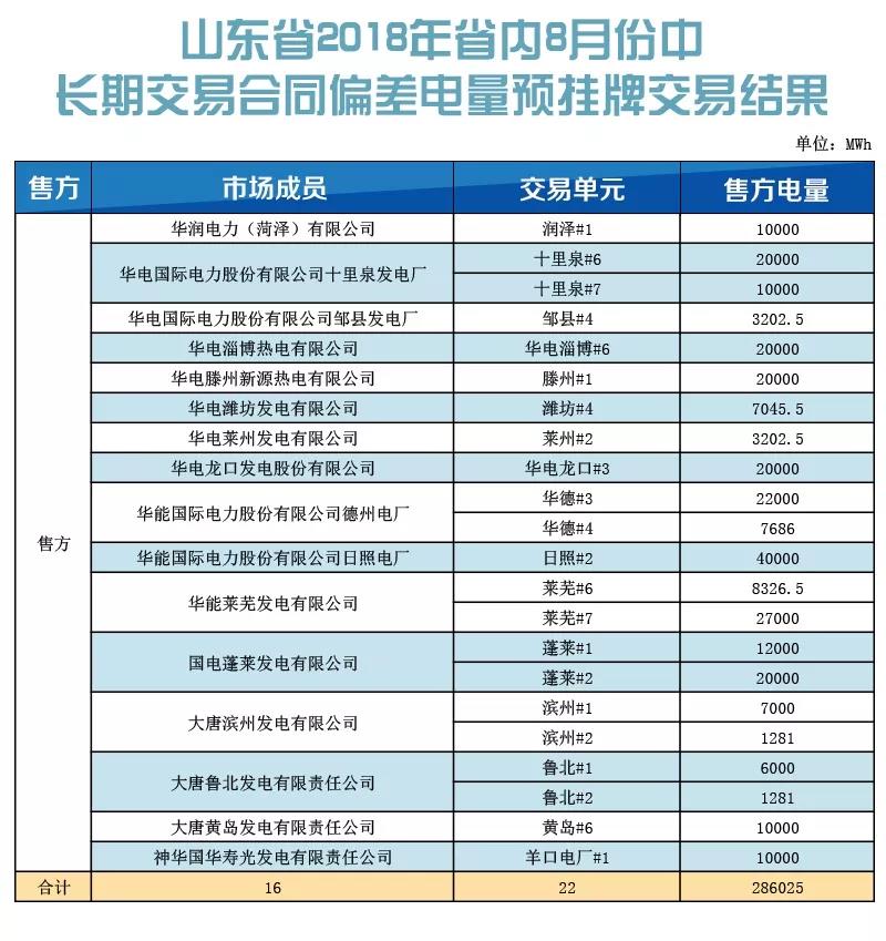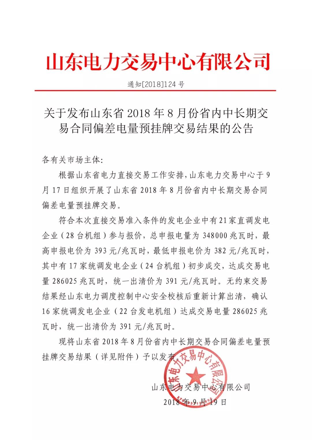 山東省2018年8月份省內(nèi)中長期交易合同偏差電量預(yù)掛牌交易結(jié)果