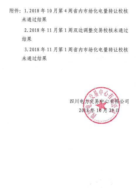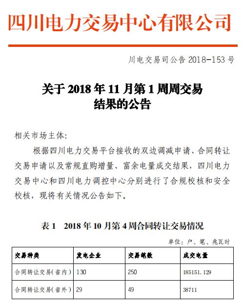 四川2018年11月第1周周交易:合同轉(zhuǎn)讓交易(省內(nèi))成交電量69561.854兆瓦時(shí)