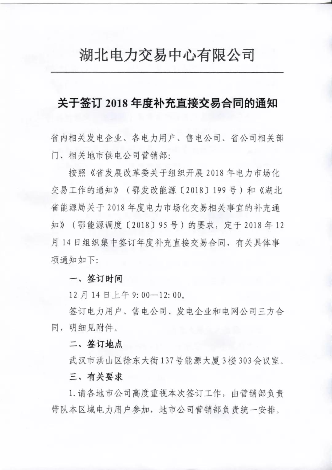 湖北關(guān)于簽訂2018年年度補(bǔ)充直接交易合同的通知