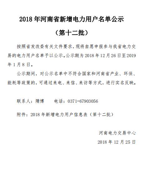 河南電力交易中心發(fā)布了《2018年河南省新增電力用戶名單公示(第十二批)》