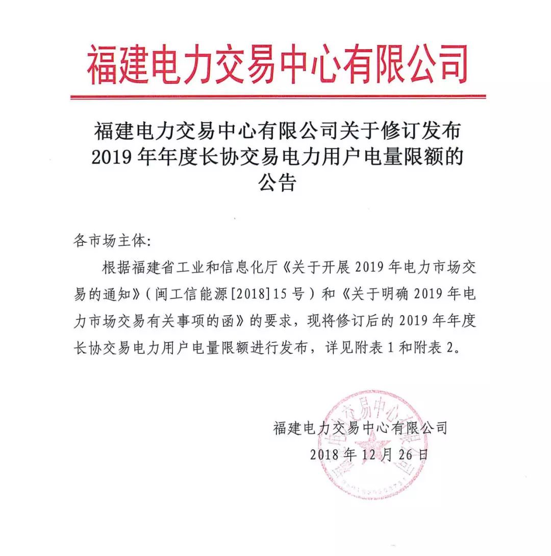 福建電力交易中心發(fā)布了《關(guān)于修訂發(fā)布2019年年度長協(xié)交易電力用戶電量限額的公告》
