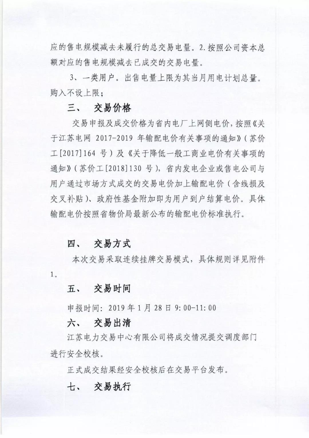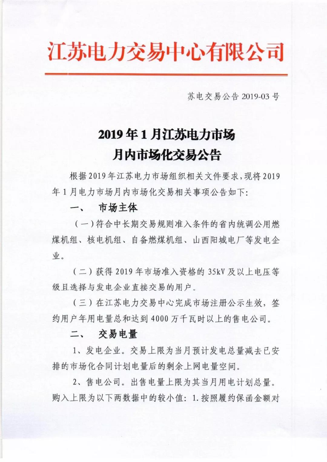 2019年1月江蘇電力市場月內(nèi)市場化交易公告