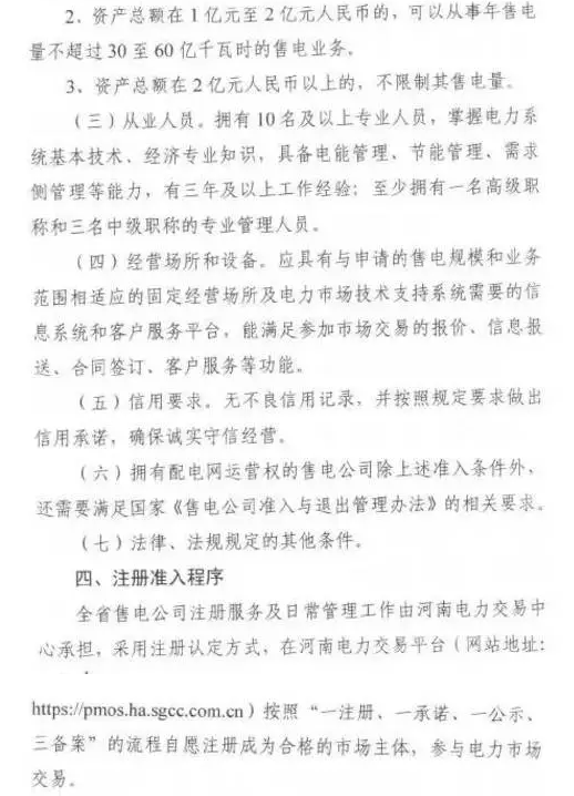 關(guān)于展開(kāi)售電公司市場(chǎng)注冊(cè)工作的通知,明確了河南注冊(cè)主體的資產(chǎn)要求、工作人員、辦公要求、注冊(cè)流程及資料等,要多途徑培育售電公司