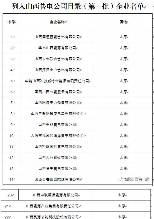 關(guān)于公布列入山西售電公司目錄(第一批)企業(yè)名單的通知