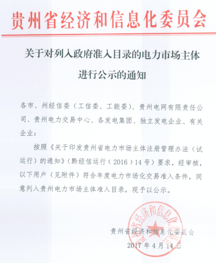 貴州省經(jīng)信委日前發(fā)布《關(guān)于對列入政府準(zhǔn)入目錄的電力市場主體進(jìn)行公示的通知》,兩家企業(yè)被列為電力市場主體。詳情如下: