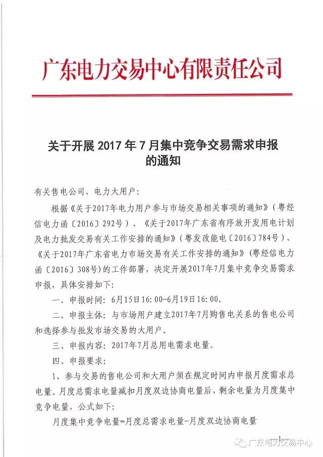 廣東電力交易中心日前發(fā)布了《2017年7月集中競(jìng)爭(zhēng)交易需求申報(bào)的通知》,通知中稱,交易時(shí)間為6月15日16:00至6月19日16:00,申報(bào)主體:與市場(chǎng)用戶建立2017年7月購(gòu)售電關(guān)系的售電公司和選擇參與批發(fā)市場(chǎng)交易的大