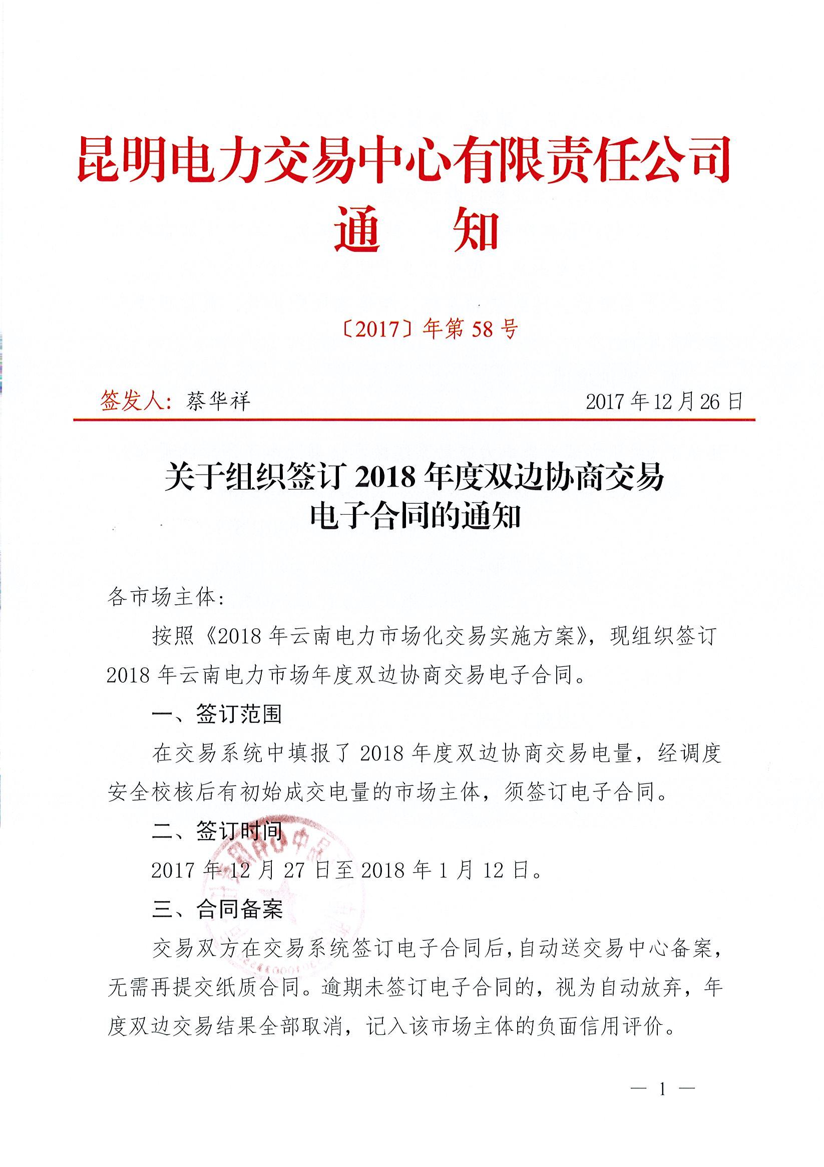 昆明電力交易中心日前發(fā)布了《關于組織簽訂2018年度雙邊協(xié)商交易電子合同的通知》,簽訂范圍包括在交易系統(tǒng)中填報了2018年度雙邊協(xié)商交易電量,經調度安全校核后有初始成交電量的市場主體。簽訂時間為2017年12月