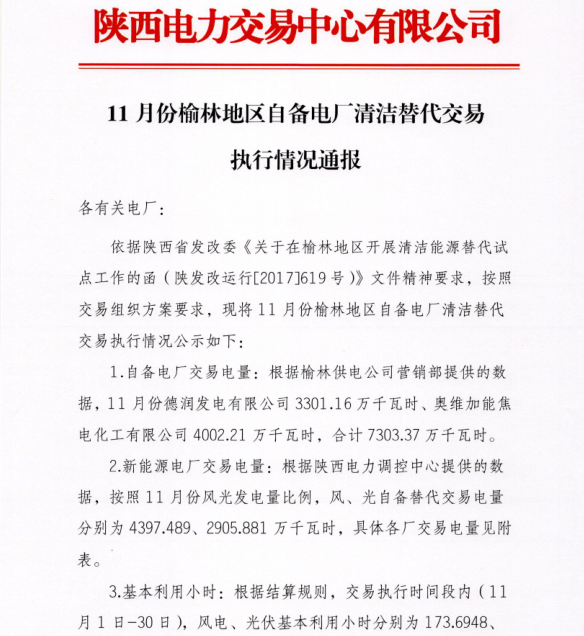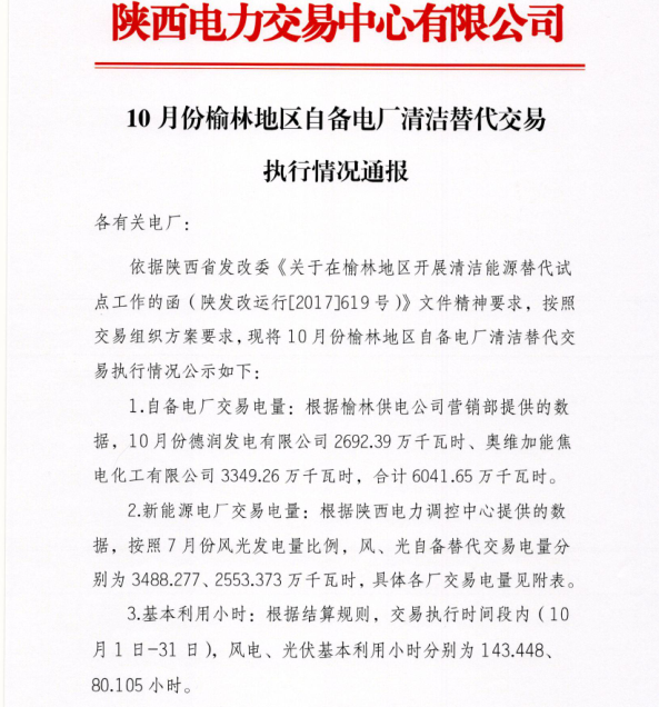 《2017年10、11月份榆林地區(qū)自備電廠清潔替代交易執(zhí)行情況通報》