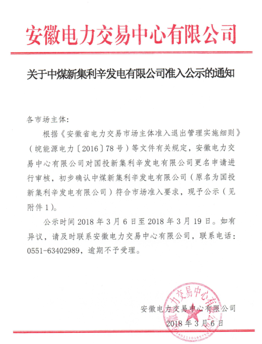 安徽電力交易中心日前發(fā)布了《關(guān)于中煤新集利辛發(fā)電有限公司準(zhǔn)入公示的通知》,安徽電力交易中心對(duì)國投新集利辛發(fā)電有限公司更名申請(qǐng)進(jìn)行了審核公示,公示時(shí)間為3月6日至3月19日。