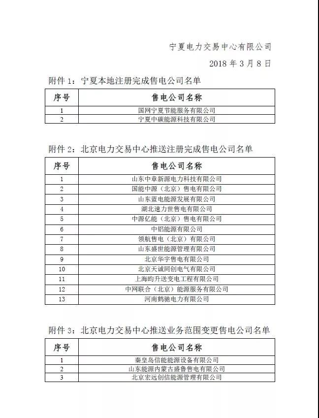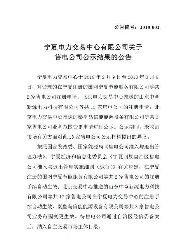 寧夏2018年2月新增18家售電公司