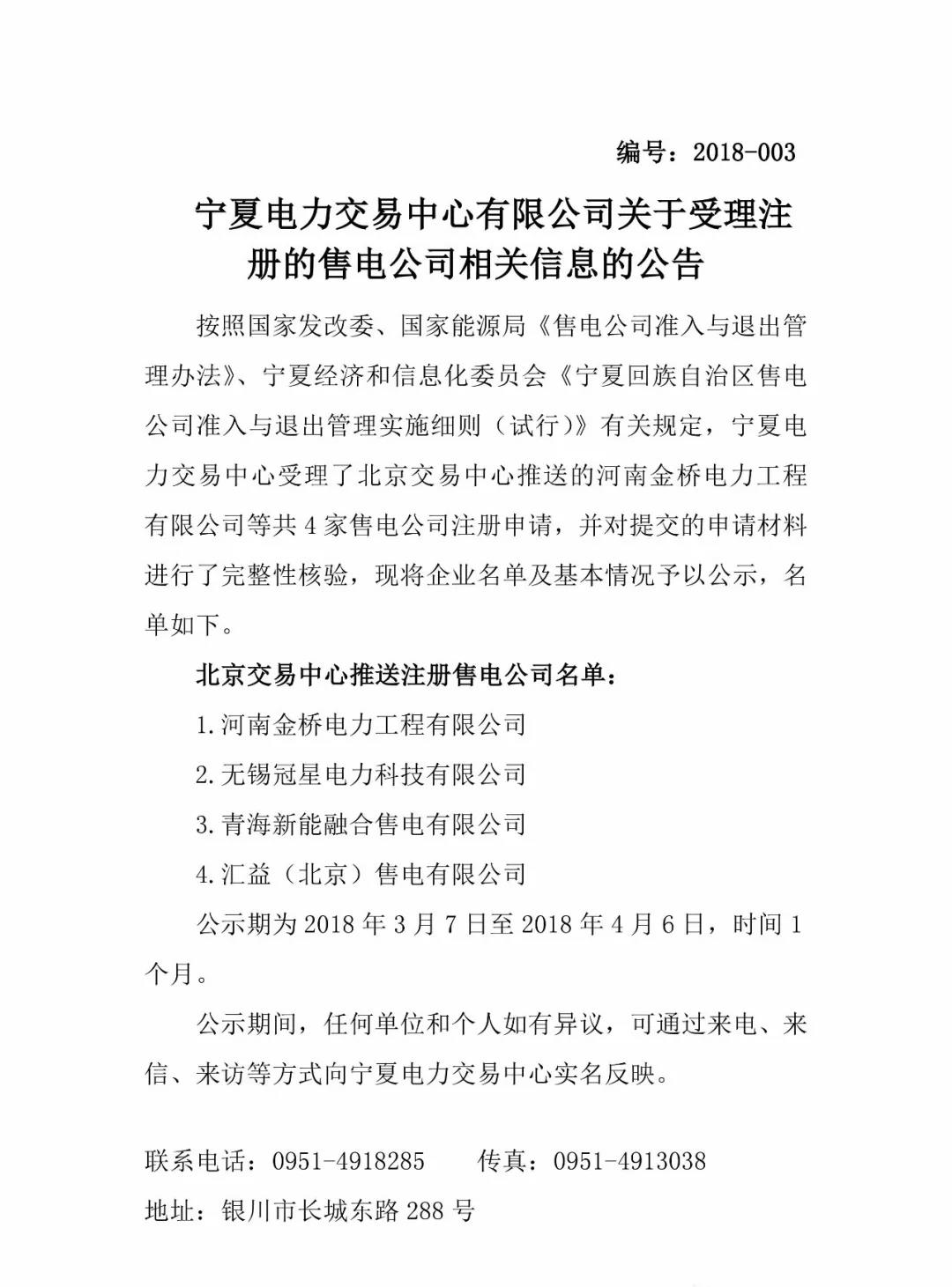 寧夏電力交易中心日前發(fā)布了關(guān)于受理注冊(cè)的售電公司相關(guān)信息的公告,公告中對(duì)北京電力交易中心推送的4家售電公司進(jìn)行了公示,公示期1個(gè)月,詳情如下: