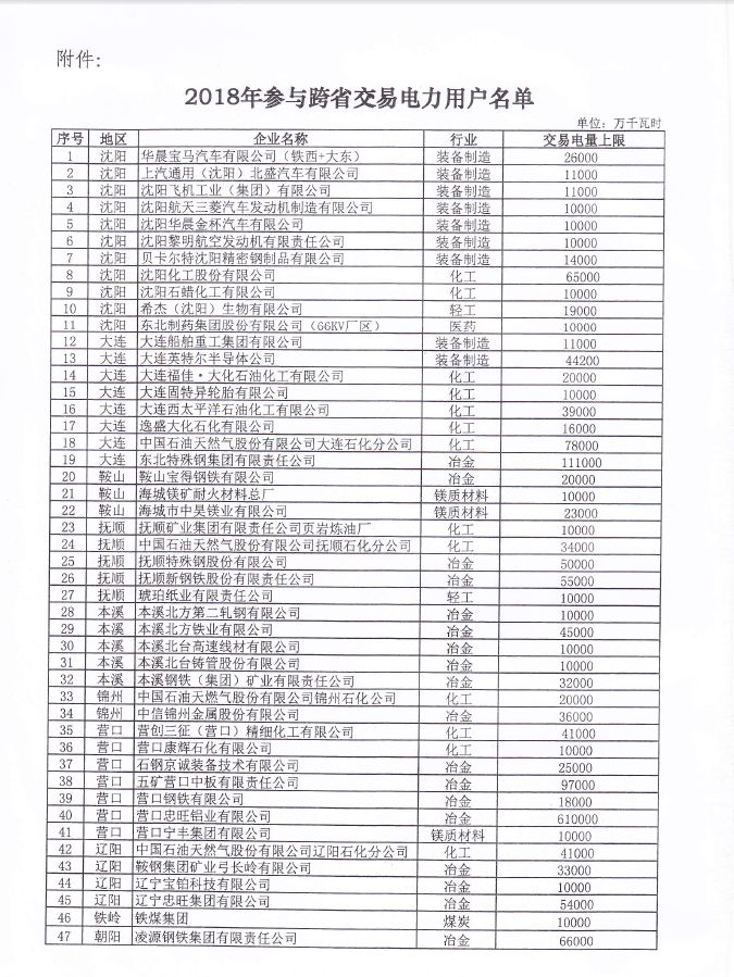 在公布的2018年參與跨省交易電力用戶名單內(nèi)共有55家企業(yè)在內(nèi),合計(jì)交易電量上限為2300200萬(wàn)千瓦時(shí),這些電力用戶分布于沈陽(yáng)、大連、鞍山、撫順、本溪、錦州、營(yíng)口、遼陽(yáng)、鐵嶺、朝陽(yáng)、盤錦、葫蘆島12個(gè)地區(qū)。