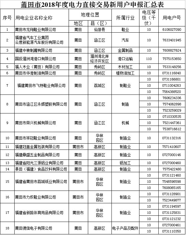 福建省經(jīng)信委分別于3月23日、26日發(fā)布了《關(guān)于2018年度電力直接交易新用戶名單的公示》及補(bǔ)充公示名單。兩批次共604家新用戶。在3月23日公...