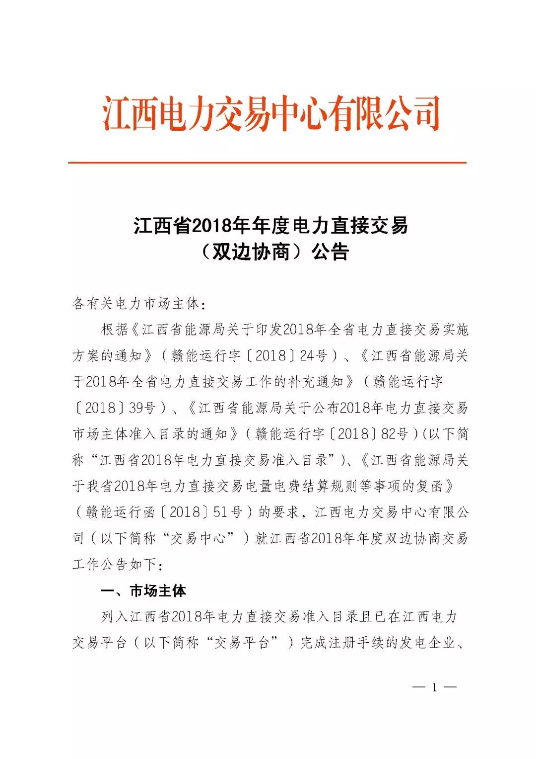 江西電力交易中心日前發(fā)布了《江西省2018年年度電力直接交易(雙邊協(xié)商)公告》,市場(chǎng)主體為列入江西省2018年電力直接交易準(zhǔn)入目錄且已在江西...