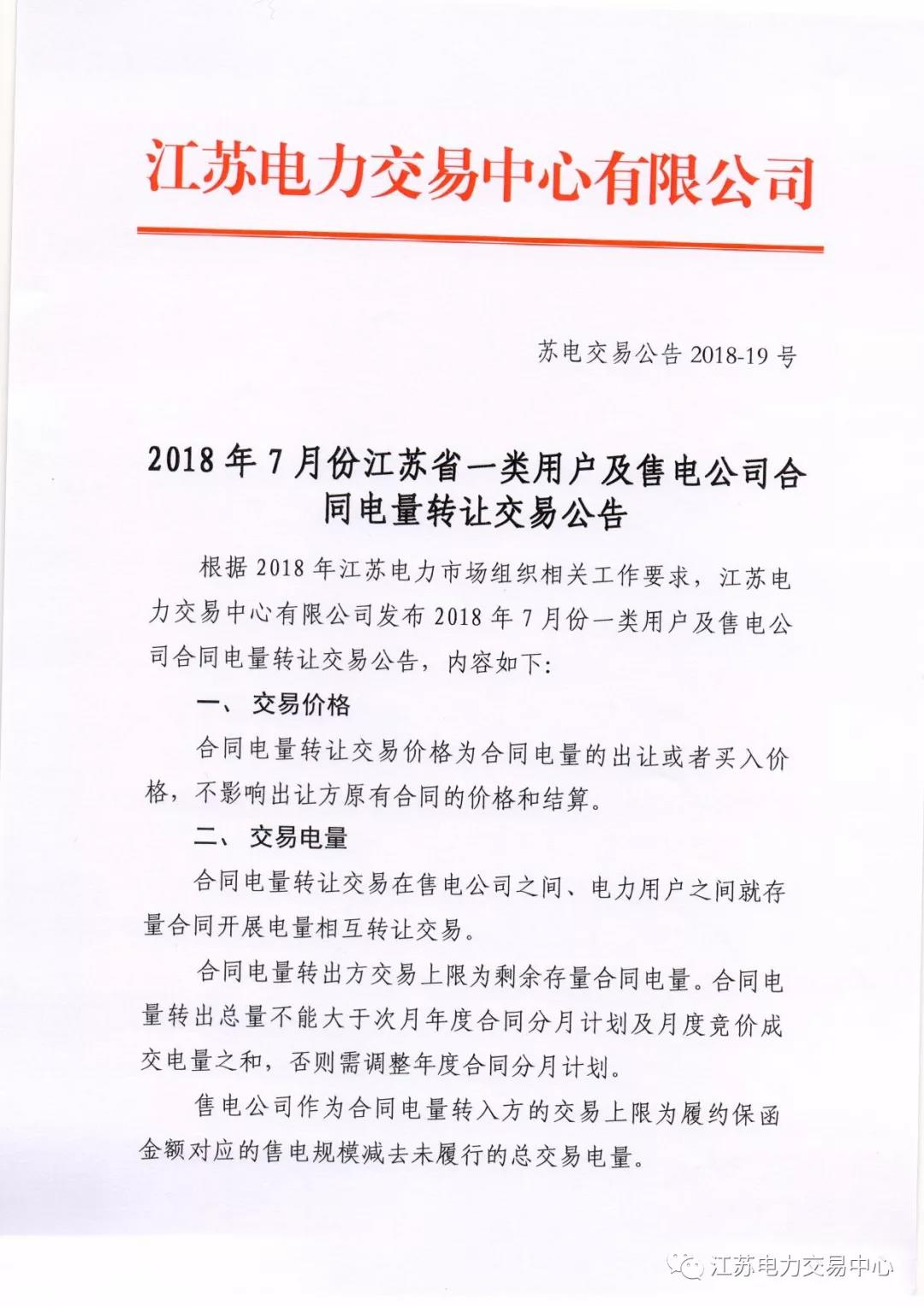 2018年7月份江蘇一類用戶及售電公司合同電量轉(zhuǎn)讓交易公告