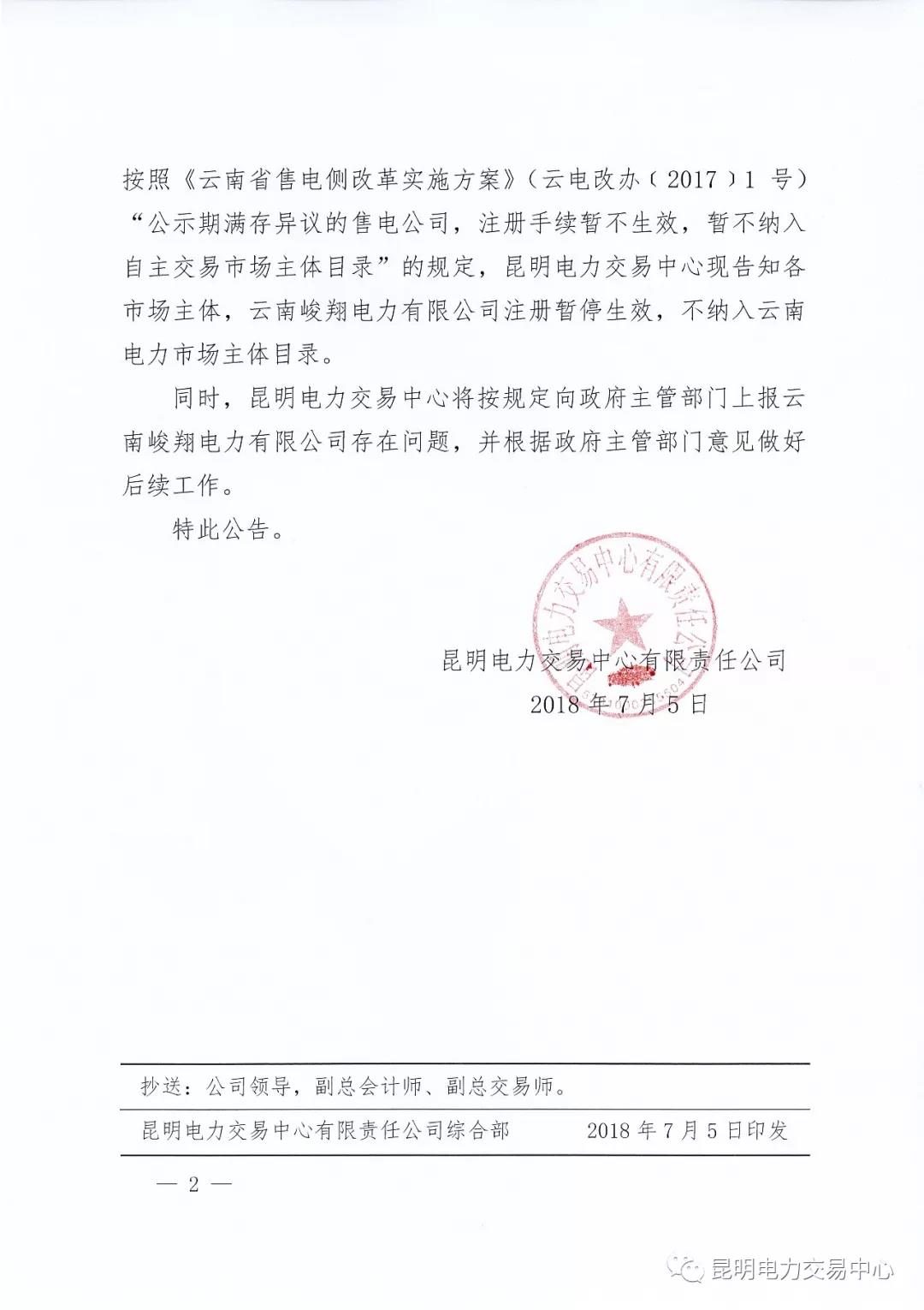 昆明電力交易中心有限責(zé)任公司關(guān)于云南峻翔電力有限公司不納入市場主體目錄的公告